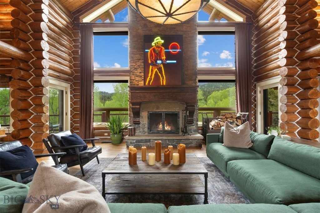 The main home welcomes guests into a large Great Room designed for entertaining. Friends and family can cozy up to the inviting custom rock wood-burning fireplace or saddle up to the bar for lively conversation. Seamlessly transition to the large deck with ample seating areas and an outdoor wood-burning fireplace. The views of the Bridger Mountains are majestic along with tranquil treed meadows and the sounds of the creek add to the ambiance.