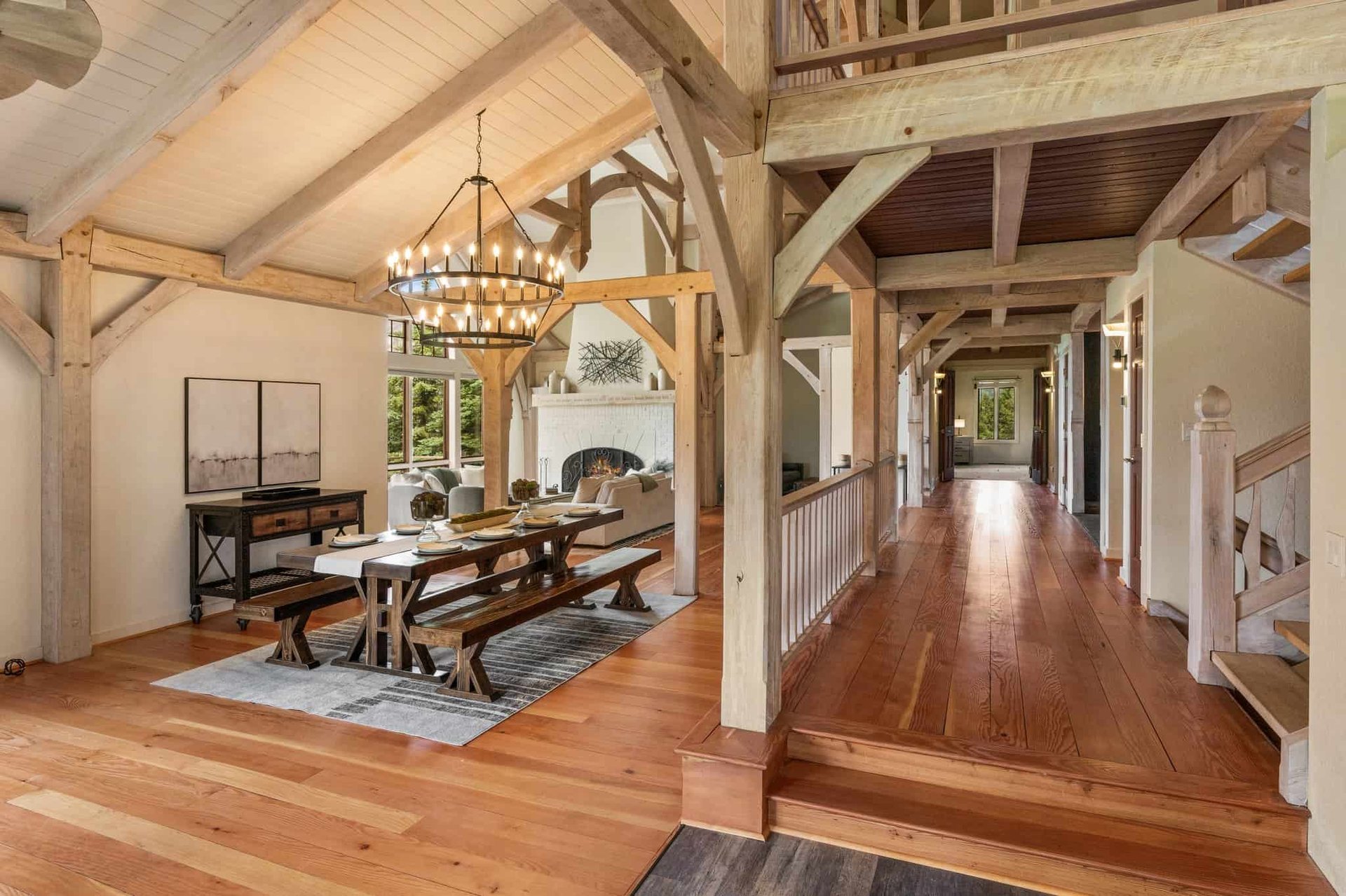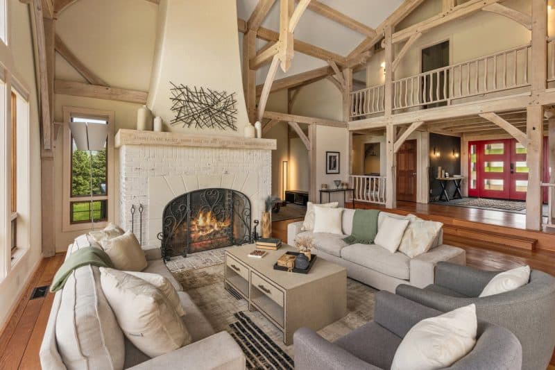 Inside, the spacious great room showcases impressive timber beams, rich wood floors, and floor-to-ceiling windows that flood the space with natural light. A stately wood-burning fireplace serves as the heart of the home, creating a warm and inviting atmosphere perfect for cozy winter evenings or entertaining guests.The main floor also features a primary suite, an office, and thoughtfully designed living spaces that blend comfort and functionality. Upstairs, two additional bedrooms and a well-appointed bathroom provide ample room for family and guests.